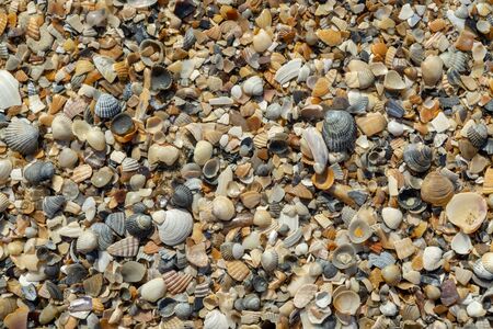 Texture backdrop background shallow small various bright smooth and embossed light, gray, pastel, brown seashells on the beach by the sea. Detail top view.