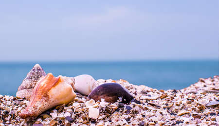 Shells or seashell at the beach with a background of sea and blue sky but without sand. Take this picture during the summer in the south of Thailand.