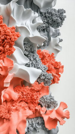 This vibrant wall art displays a stunning array of coral-inspired textures in coral, gray, and white hues. The intricate designs create a lively atmosphere perfect for modern decor.