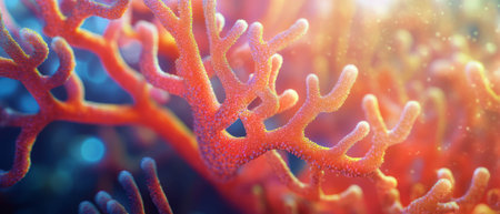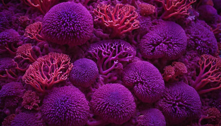 Ultra-detailed coral reef texture, vibrant branching formations in pinks, purples, and oranges.