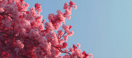 Pink cherry blossoms on branches against a clear, azure sky. Shallow depth of field