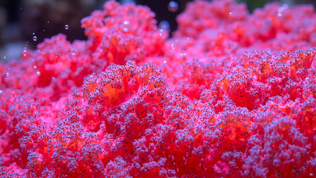Vivid neon pink soft coral with tentacle like polyps and rising bubbles in the background
