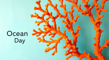 Bright orange coral branch on blue background with “Ocean Day†text for marine conservation and environmental awareness campaigns.
