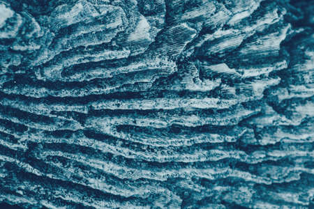 Closeup macro shot of textured sea ocean blue wavy stone rock with cavities lines, background wallpaper, toned with retro vintage film effect style filters