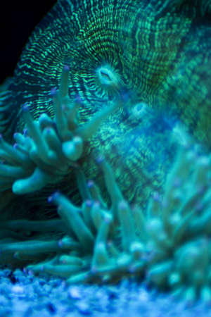 Underwater photo - orange flower like corals emitting light under UV bulb, abstract marine background, shallow depth of field photo only few tentacles in focus.