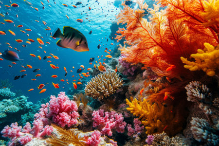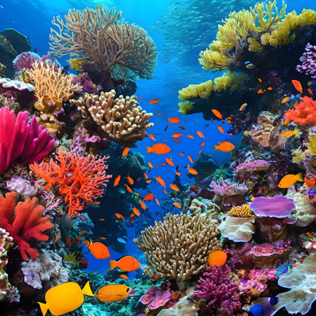 Vibrant coral reef ecosystem teeming with diverse array of colorful marine life and fish swimming in the clear blue waters of the tropical ocean