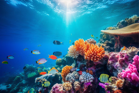 Underwater view of coral reef with tropical fish and sunbeams