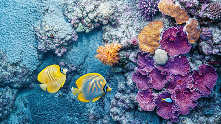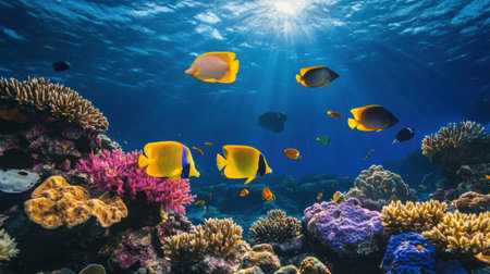 An enchanting underwater scene showcasing vibrant tropical fish and colorful coral reefs in crystal clear water. Ideal for nature lovers and aquatic enthusiasts.
