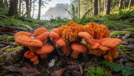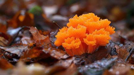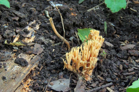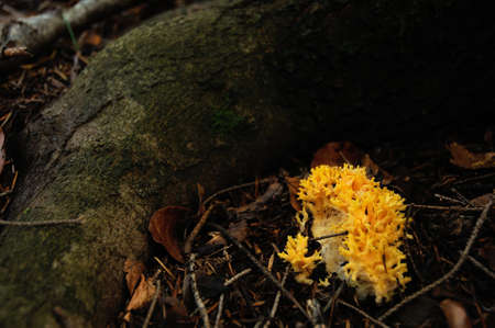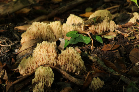 Closeup view of mushrooms Ramaria aurea grows on roots of trees between leaves and branches