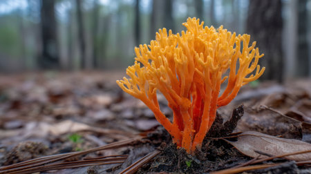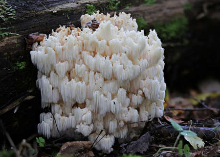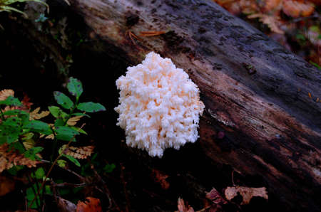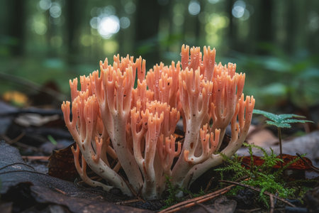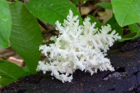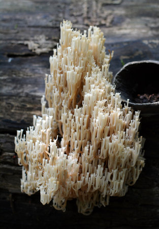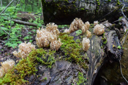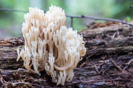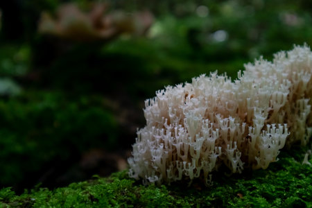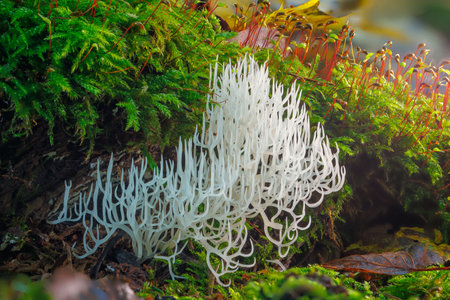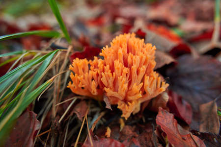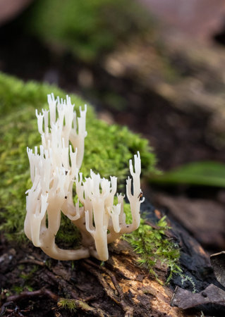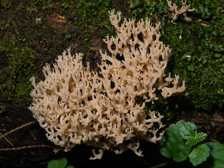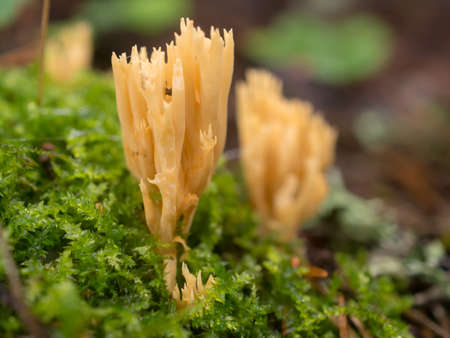 The coral mushroom grows in its natural environment. Closeup with shallow depth of field.