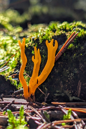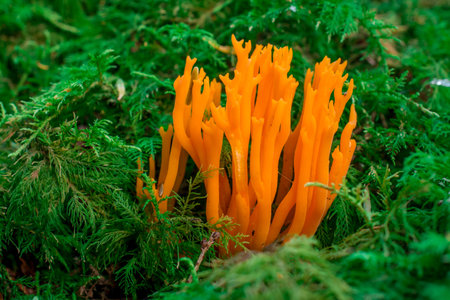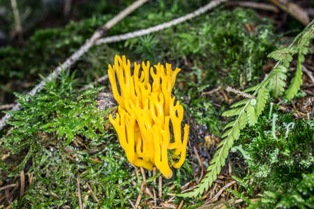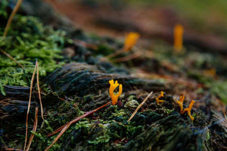 interesting beautiful yellow inedible coral mushrooms Calocera viscosa growing in forest moss