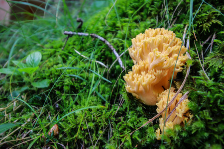 Coral mushroom (Ramaria aurea). Another scientific names are Clavaria aurea and Ramaria flavobrunnescens. green grass