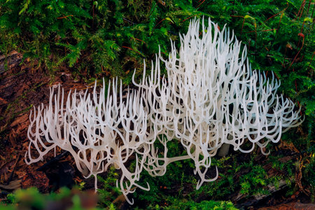A cluster of white coral fungus, resembling antlers, sprouts from the damp forest floor amidst decaying leaves and moss