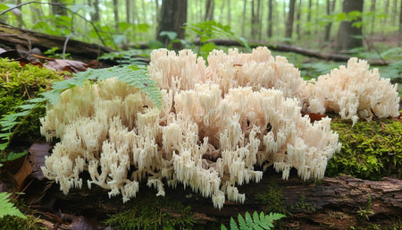 Delicate white coral fungi emerge from a lush carpet of green moss, creating a whimsical scene in the woodland