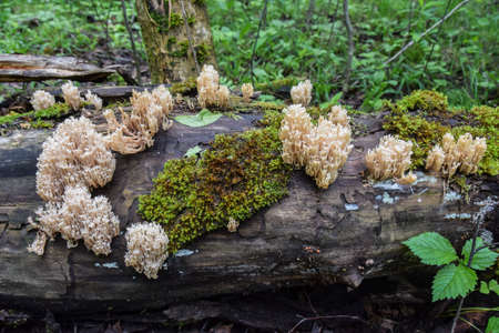 Colony of staghorn mushrooms in the form of corals on a dead tree trunk.