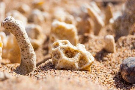 Many small white dry corals lying on the sand on the Red Sea beach in Eilat, Israel