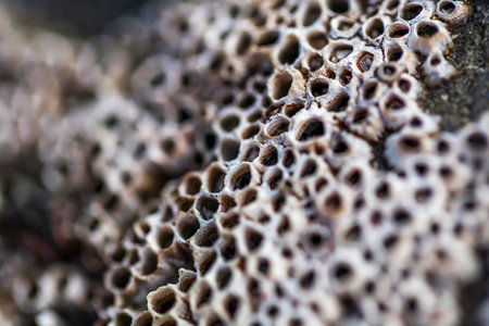 Coral texture close-up. Dead coral reef macro photo. White coral filter comb macrophotography. Seashore organism structure. Abstract natural texture. Tropical sea animal detail. Beach shell background