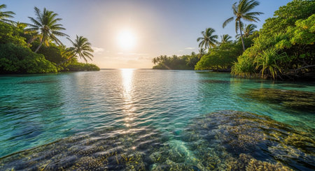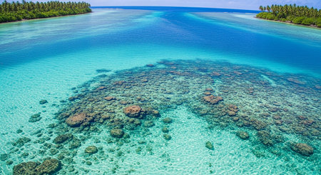 This stunning image captures a tranquil tropical lagoon filled with vibrant coral reefs and crystal clear waters under a bright blue sky.