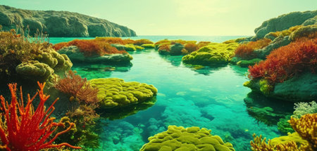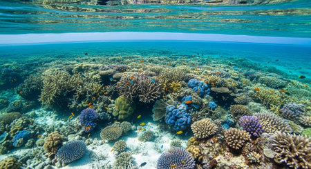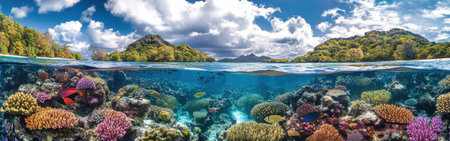 Vibrant coral reef panorama showcasing colorful marine life under clear waters