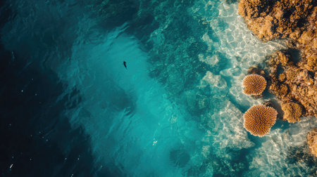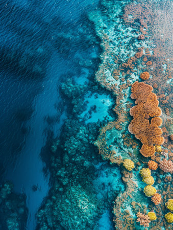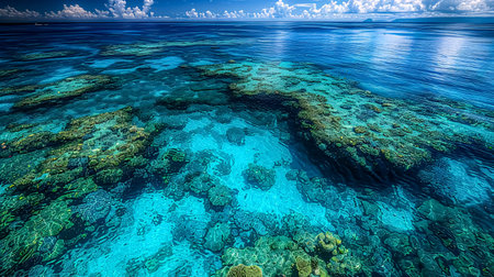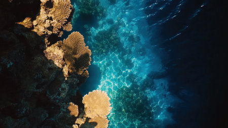 An aerial perspective showcases a stunning coral reef system with varied textures and colors, from the deep blue ocean to the shallows. The image captures the natural beauty of the underwater environment, highlighting the interaction of sunlight and sea. Suitable for a range of uses in environmental, travel, and educational content.