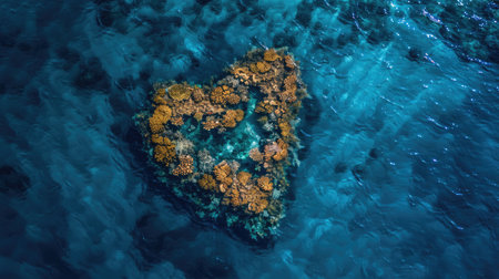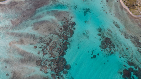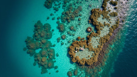 A stunning aerial view reveals intricate coral formations surrounded by crystal clear waters. The vibrant colors and patterns highlight the beauty of marine life and natural habitats.