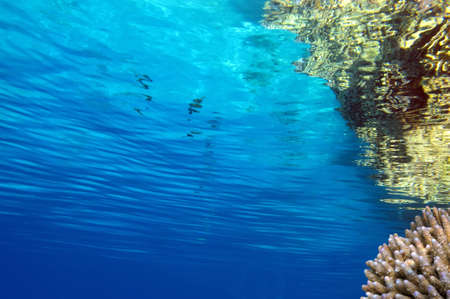 Coral reef and water surface. Tropical underwater landscape. Panorama