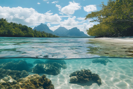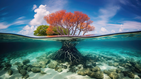Split-view of a tropical coral reef underwater and lush mangrove forest above