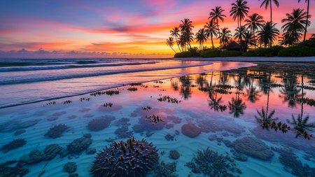 Beautiful sunset on the tropical beach with palm trees and coral reef