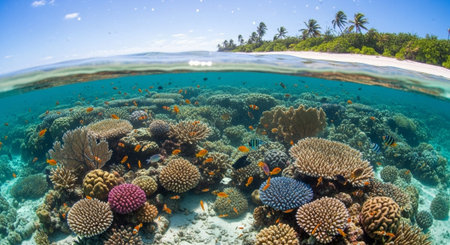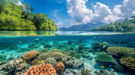 A stunning underwater view capturing a vibrant coral reef alongside a tropical island backdrop. Sunlight filters through crystal clear water, showcasing marine life.