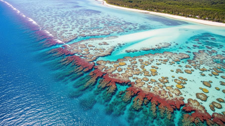 A breathtaking aerial view of a coral reef, with vibrant underwater formations visible through the crystal-clear water. The scene captures the beauty and diversity of marine life.