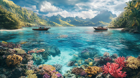 A view of a coral reef in the foreground with towering mountains in the background. The underwater scene shows colorful coral, fish, and other marine life thriving in their natural habitat.