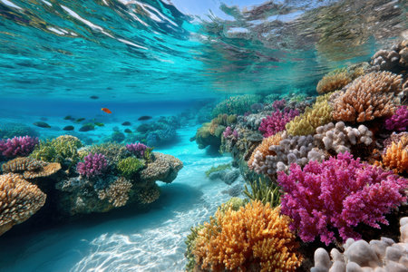 Vibrant coral reef teeming with colorful marine life in crystal-clear waters
