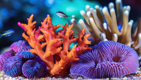Aesthetic oceanic colorful fluorescent coral reef on blue background. Copy space. Aquarium hobby. Generative AI.