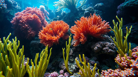 This image showcases a colorful coral reef ecosystem, highlighting various coral formations in shades of red, yellow, and blue. The underwater scene features textured surfaces and soft lighting, creating a natural environment. Suitable for ecological studies, educational resources, and decorative applications.