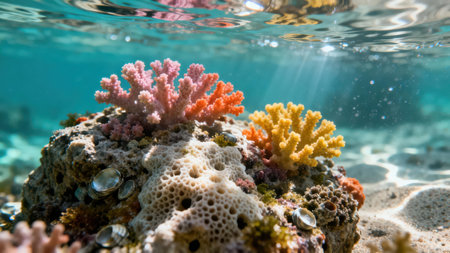 A vivid display of coral formations showcases intricate textures and colors, illuminated by sunlight filtering through clear water, highlighting the beauty of marine life.