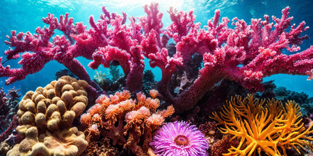 Vibrant coral reef with colorful flowers and sunlight shining through the water