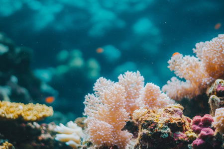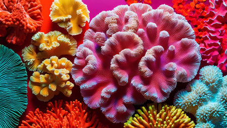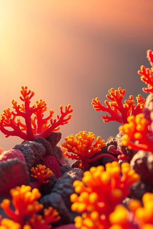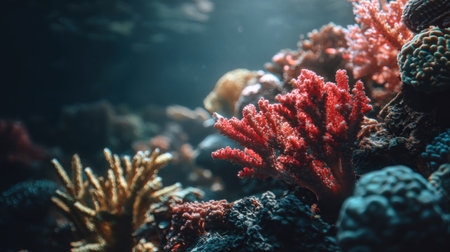 This image showcases a colorful coral reef ecosystem, highlighting various coral formations in shades of red, yellow, and blue. The underwater scene features textured surfaces and soft lighting, creating a natural environment. Suitable for ecological studies, educational resources, and decorative applications.