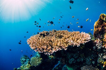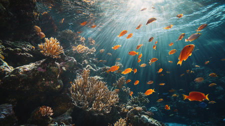 Underwater view of coral reef with tropical fish and sunbeams
