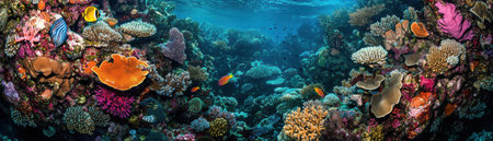 Discover this immersive panoramic view of a thriving coral reef bursting with orange, pink, and purple corals alongside schools of exotic fish in crystal-clear turquoise waters. Ideal for scuba travel ads, marine biology content, aquarium backgrounds, and ocean conservation campaigns.