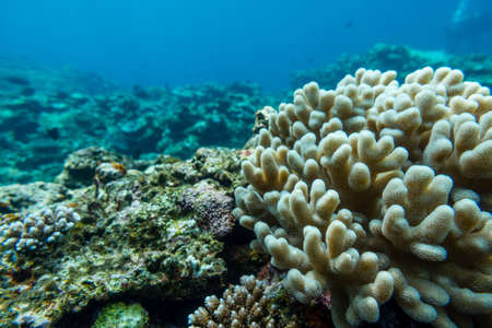 Colorful coral reef at the bottom of tropical sea, hard corals, underwater landscape