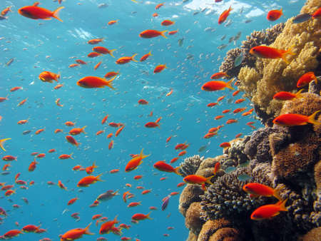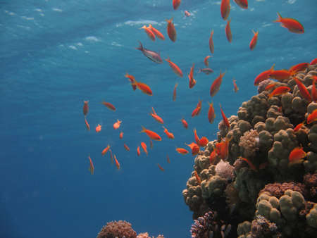 lot of little red light on coral reef fish in the sea