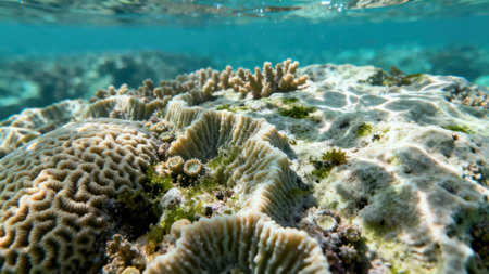 A vivid display of coral formations showcases intricate textures and colors, illuminated by sunlight filtering through clear water, highlighting the beauty of marine life.