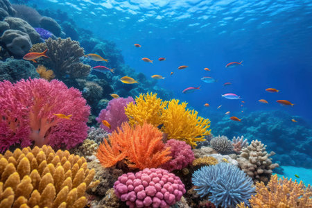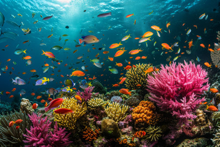 School of fish swim through colorful coral generated by artificial intelligence