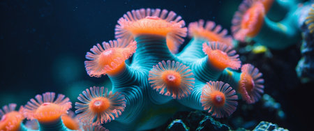 Underwater photo - orange flower like corals emitting light under UV bulb, abstract marine background, shallow depth of field photo only few tentacles in focus.
