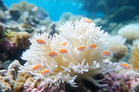 Diverse marine life thrives in a colorful coral reef, with bright orange clownfish swimming gracefully around intricate coral formations in crystal-clear waters.