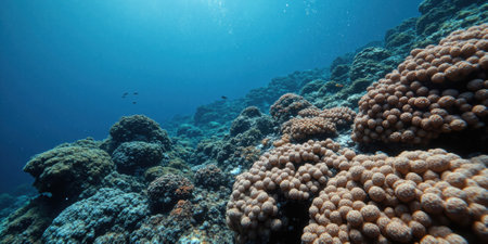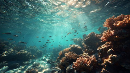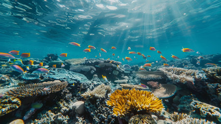 Explore the vibrant colors of a thriving underwater coral reef bustling with life and colorful fish swimming gracefully