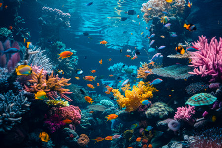 Beneath the oceans surface, a vibrant coral reef thrives, teeming with a kaleidoscope of marine life, from colorful fish and graceful sea turtles to swaying anemones and intricate coral formations.. AI generated.