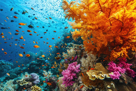 Vibrant coral reef ecosystem teeming with diverse array of colorful marine life and fish swimming in the clear blue waters of the tropical ocean