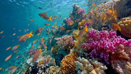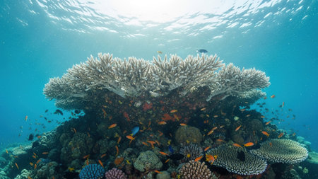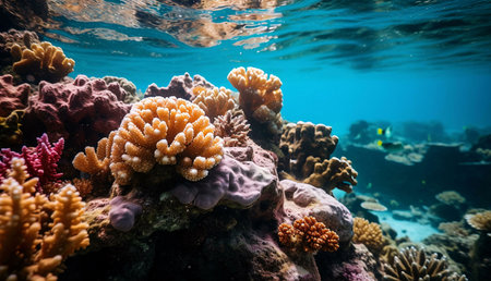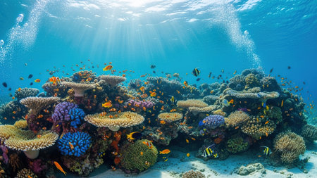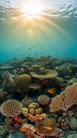 Vibrant coral reef teeming with marine life under sunlit ocean waters