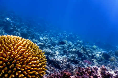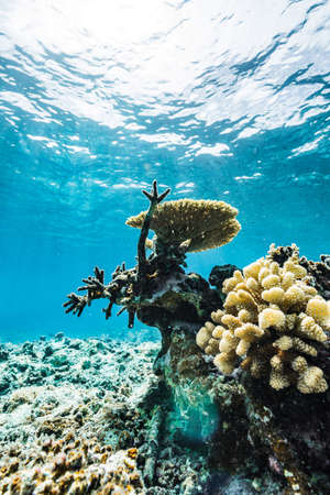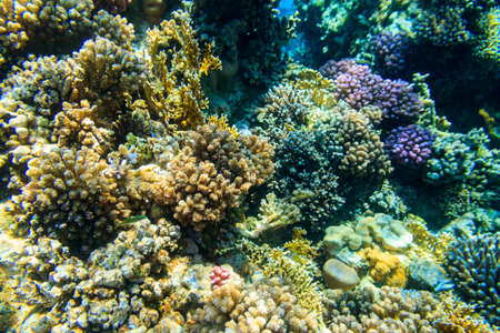 Colorful coral reef at the bottom of tropical sea, hard corals, underwater landscape